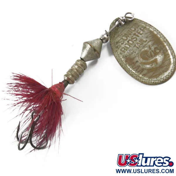 Estampillée du nom distinctif « SONIC ROOSTER TAIL » sur sa palette texturée en argent en forme de feuille de saule, cette cuiller de 2,4 g (3/32 oz) représente une époque classique du savoir-faire de Yakima Bait. Mesurant 4 cm (1 1/2"), le leurre présente l'emblématique queue en plumes de hackle rouge nouée à la main, un incontournable pour les pêcheurs de truites depuis que Howard Worden les a développées dans les années 1950. Le corps est construit avec un torse argenté lesté et segmenté, ainsi qu'une perle biconique unique qui facilite la rotation de la palette autour de l'axe métallique. Répertorié sous le code produit 3456, ce spécimen montre des signes honnêtes d'âge avec une légère usure de surface sur les composants métalliques, bien que les plumes rouges restent denses et l'armature solide, lui valant une note d'état de 4/5. Les collectionneurs apprécieront la bordure à motifs de points complexes sur la palette, une signature de la variante « Sonic » conçue pour des fréquences de vibration spécifiques lors d'une récupération linéaire. L'hameçon triple est dissimulé proprement dans le hackle, maintenant le profil profilé nécessaire pour lancer dans les petits trous de courant.