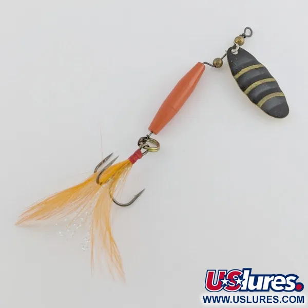 Un corps vibrant orange-rouge en forme de cigare ancre cette cuiller tournante in-line classique, reflétant l'excellence de fabrication de la Worth Company basée à Stevens Point, Wisconsin. Comme Worth est légendaire pour la fourniture de composants haut de gamme tels que les anneaux brisés et les émerillons à l'ensemble de l'industrie de la pêche, un leurre fini comme ce #301, identifié par le code produit 24436, met en valeur leur matériel de précision dans un ensemble complet. La palette en forme de goutte d'eau présente une face noire frappante avec des rayures festonnées dorées, tandis que le revers révèle une texture d'or martelé. Ce spécimen, classé 5/5 en condition, comprend un hameçon triple garni de plumes orange et jaunes maintenues par un enroulement de fil rouge impeccable. L'assemblage utilise de petites perles en laiton et un étrier spécialisé pour faciliter une rotation fluide lors d'une récupération régulière en eau douce pour la truite ou l'achigan. C'est un solide exemple de l'artisanat américain du milieu du siècle provenant du cœur du Midwest.