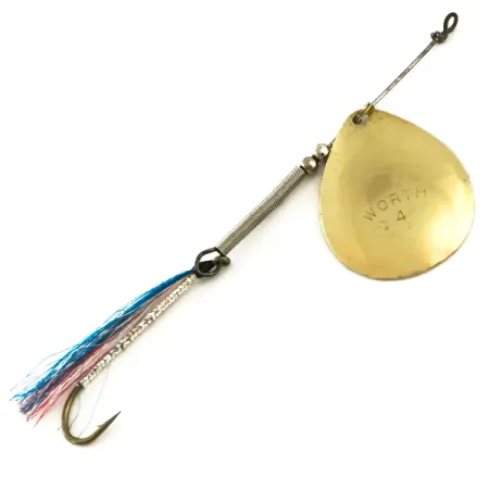 Le marquage « WORTH 4 » est clairement estampé sur la palette couleur laiton, identifiant cette cuillère tournante américaine classique. Worth, une entreprise synonyme de composants de pêche de qualité, a produit ce modèle 6285 avec une palette en forme de goutte d'eau qui tourne sur une tige métallique robuste. Mesurant 10 cm (4") de long pour un poids de 3,5 g (1/8 oz), le corps du leurre est constitué d'un ressort métallique hélicoïdal distinctif et d'une paire de petites perles d'espacement. La finition en laiton de la palette offre une surface brillante et réfléchissante qui contraste avec l'habillage noué à la main sur l'hameçon simple de queue. Cet habillage se compose de brins de tinsel bleus, blancs et rose-rouge fixés par un fil noir. Dans son état actuel, le leurre conserve une note de 5/5, la tige et l'hameçon restant parfaitement droits et les composants montrant un éclat significatif.