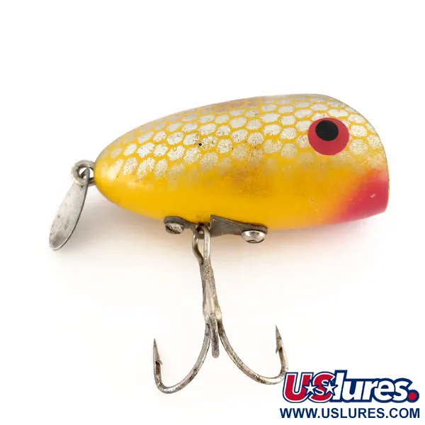 Mesurant 4,5 cm (1 3/4"), le profil compact de ce leurre de surface est exceptionnel pour les lancers légers. Connu sous le nom de Wright & McGill Rustler, ce modèle de 10 g (1/3 oz) porte le code produit 9813 et est conçu pour une profondeur de 0 m (0 ft) ou une récupération très peu profonde. Le corps présente une finition jaune vif recouverte d'un motif d'écailles en nid d'abeille qui rejoint une face concave noire distinctive. Une touche de rouge couvre le menton et entoure les grandes pupilles noires. À l'arrière, une petite palette métallique est fixée pour produire des reflets, tandis que l'armement ventral est monté via une plaque métallique spéciale supportant un unique hameçon triple. Ce spécimen est classé 5/5, préservant l'esthétique classique de l'artisanat américain vintage.