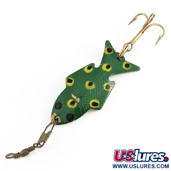 Revêtu d'une finition classique Frog présentant des taches noires cerclées de jaune, ce Wright & McGill Wright Fish affiche un poids polyvalent de 1/4 oz (7 g). Sa construction en laiton embouti constitue une base solide pour ce profil de 1 1/2" (4 cm), dont la forme évoque un petit poisson fourrage à la queue entaillée. Au revers, le laiton conserve son éclat métallique d'origine, tandis que la face garde l'essentiel de son pigment vert vif malgré une légère usure de surface. Un hameçon triple à la finition dorée est solidement fixé par un anneau brisé à la queue, complété par un ensemble vintage d'émerillon et d'agrafe au nez pour le raccordement de la ligne. Ce spécimen, portant le code produit 21825, témoigne du savoir-faire américain du milieu du siècle dernier et présente un état de conservation de 4/5, avec de légers éclats de peinture laissant apparaître le métal. Un motif d'écailles à la texture fine est visible sur la partie inférieure des flancs, ajoutant une complexité visuelle au corps en métal estampé.