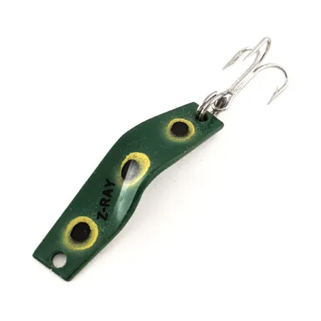 Trois points noirs distincts entourés d'un liseré jaune pâle ornent le corps vert profond de cette cuillère ondulante classique au motif Frog. Pesant un délicat 1/8oz (3,6 g), ce modèle de Z-Ray Lures (code produit 11505) est un parfait exemple du modèle à lancer de 1 1/2" (3,5 cm). Le nom de la marque est tamponné en noir sur la face supérieure, et la finition globale reste dans un excellent état 5/5. Cette conception particulière présente un profil unique à double courbure, conçu par le fabricant américain pour réfléchir la lumière différemment des cuillères plates traditionnelles. Un hameçon triple argenté est fixé à l'arrière par un anneau brisé robuste, tandis qu'un œillet de fixation se trouve à l'avant. Le dessous du métal est peint d'un vert uniforme pour s'accorder à la couleur de base.
