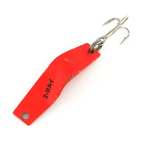 Une peinture rose fluorescent recouvre le corps en métal embouti, offrant une grande visibilité pour cibler la truite ou les perches en eaux troubles. Un marquage noir distinctif « Z-RAY » est clairement visible sur le côté de la lame de 3,6 cm (1 1/2"), l'identifiant comme un produit classique de Z-RAY Lures, fabriqué aux États-Unis. L'armement comprend un anneau brisé robuste tenant un hameçon triple piquant, maintenant le poids total à un léger 3,6 g (1/8 oz). Son profil incurvé distinctif est conçu pour le lancer, et l'œillet unique à la tête est prévu pour un raccord direct de la ligne. Ce leurre spécifique, portant le code produit 7317, est en excellent état avec une note de 5/5, ne montrant que les plus légers signes de manipulation au fil des ans.