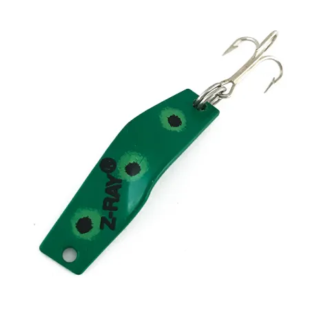 Pesant 1/8oz (4g), cette cuillère Z-Ray compacte représente le côté finesse des cuillères de fabrication américaine. Le motif de couleur « Frog » présente une base vert foncé avec trois points circulaires distincts – centres noirs entourés d'un halo vert plus clair – appliqués sur la face convexe. La marque « Z-RAY® » est estampillée clairement à l'encre noire, identifiant son origine américaine. Mesurant 1 1/2" (4cm), le corps en métal embouti présente une légère courbe en S et un trou de fixation unique à la tête pour un nœud direct ou l'utilisation d'une agrafe. Un hameçon triple de couleur argent brillant est fixé à la queue par un anneau brisé. Ce spécimen, portant le code produit 8255, affiche un état de 5/5, montrant une finition de peinture exceptionnellement propre et une quincaillerie éclatante. Il reste un exemple classique de leurre conçu pour le lancer ou la traîne de la truite et des poissons de friture.