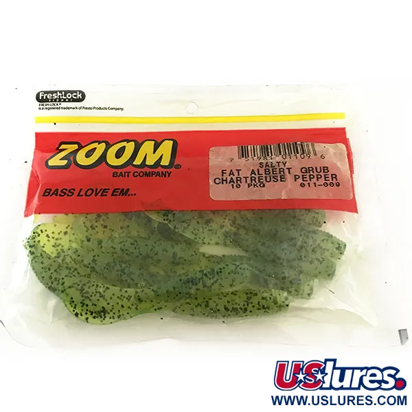 Le Chartreuse Pepper est la couleur phare de ces spécimens, présentant une base verte translucide haute visibilité chargée de fines paillettes noires. Mesurant 3 1/4" (8,25 cm), ces leurres souples représentent un design emblématique de la Zoom Bait Company de Watkinsville, Géorgie. Le profil du Fat Albert se caractérise par un corps trapu et fortement annelé qui s'affine en une queue en faucille large et fine. Ce paquet spécifique, identifié par le code produit 6678, contient 10 leurres neufs dans leur sachet zippé d'origine. La texture annelée du corps est un choix de conception délibéré pour augmenter la surface de contact, une caractéristique commune des leurres souples américains destinés au jigging. Chaque virgule de ce lot présente une saturation de couleur et une distribution de paillettes constantes sur toute la longueur de 8,25 cm. L'emballage est intact, affichant la bande rouge classique et les coordonnées du fabricant.