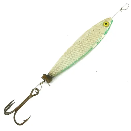 Un motif d'écailles texturé définit le corps de ce ZZINGER Buzz Bomb fabriqué au Canada, créant une surface multi-facettes qui reflète la lumière à travers sa finition perle. Pesant 18 g (2/3 oz) et mesurant 5,5 cm (2 1/4"), ce jig vertical présente une teinte verte distinctive le long de son dos et un œil jaune vif avec une pupille sombre. Répertorié sous le code produit 7065, ce spécimen est dans un état 5/5, affichant une peinture bien conservée et un armement d'origine solide. Le leurre au corps en plomb de ZZINGER LURES est construit autour d'une armature traversante qui maintient l'hameçon triple, une conception spécifiquement destinée au jigging vertical. Le relief des écailles est constant sur les deux côtés du corps symétrique, s'affinant progressivement vers les boucles métalliques à chaque extrémité.